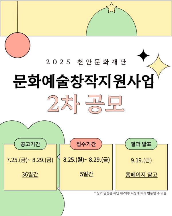 [충청뉴스 유규상 기자] 천안문화재단(대표이사 안동순, 이하 재단)은 오는 8월 29일까지 ‘문화예술 창작 지원사업 2차 공모’를 추진한다.