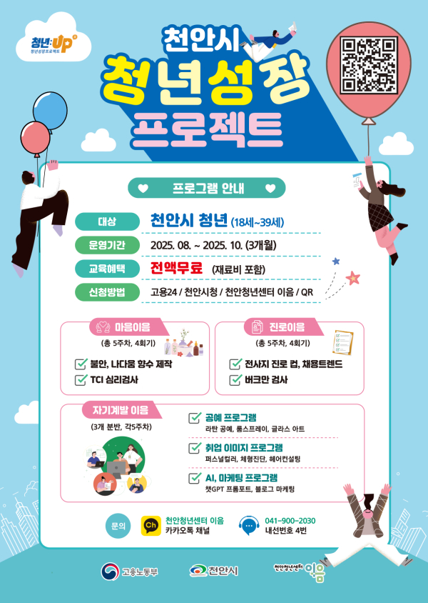 [충청뉴스 유규상 기자] 천안시는 ‘쉬었음’ 청년을 위한 ‘청년성장프로젝트’ 참여대상 250명을 선착순으로 모집한다. 자격요건은 천안시에 거주하는 만 18~39세 청년이다.