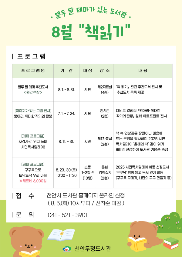 프로그램 접수는 오는 8월 5일부터 천안시도서관 누리집에서 가능하며, 문의 사항은 두정도서관(041-521-3901)으로 하면 된다.