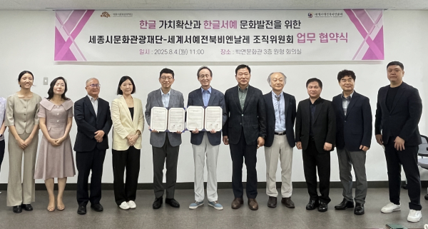 [충청뉴스 최형순 기자] 세종시문화관광재단(대표이사 박영국)이 세계서예전북비엔날레 조직위원회(위원장 송하진)와 한글문화의 세계적 확산 및 한글서예 발전을 위한 업무협약을 맺었다.