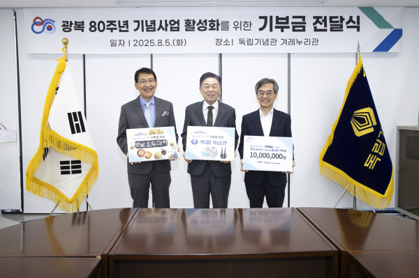 [충청뉴스 유규상 기자] 독립기념관(관장 김형석)은 지난 5일 독립기념관 겨레누리관에서 천안옛날호두과자와 함께 ‘광복 80주년 기념사업 활성화를 위한 기부금 전달식’을 개최했다.