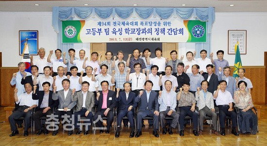 대전시는 12일 구) 충남도청 대회의실에서 염홍철 시장, 김신호 교육감 및 고등부 팀 육성 학교장 등 60여명이 참여한 가운데 전국체전 목표달성을 위한 정책간담회를 가졌다.