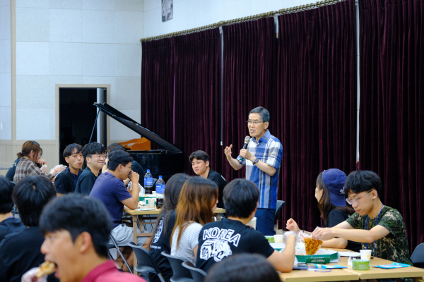 유길상 총장이 유스호스텔에서 열린 간담회에서 학생들의 질문에 답하고 있다.