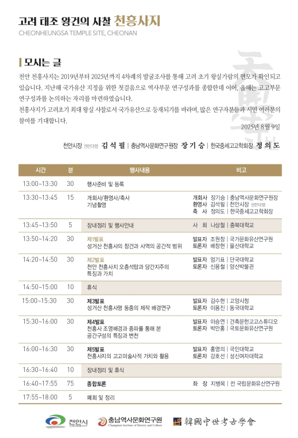 여러 분야 전문가가 참석해 성거산 천흥사의 창건과 사역의 공간적 범위, 천안 천흥사지 오층석탑과 당간지주의 특징과 가치 등을 주제로 발표와 토론을 진행할 예정이며, 관련 주제에 관심이 있는 시민이라면 누구나 무료로 참석할 수 있다.