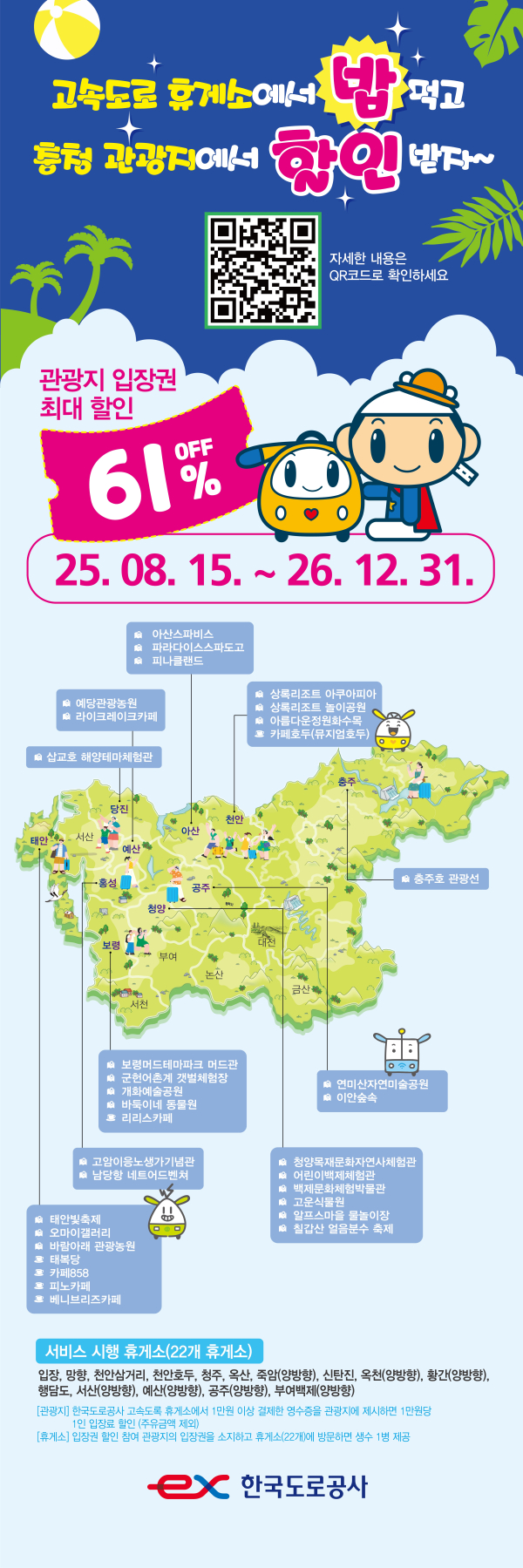 - 충청권 휴게소 22곳 영수증 제출하면 관광지 31개소 입장료 최대 61% 할인