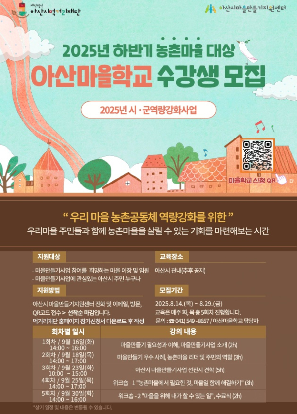 마을학교는 현장포럼 및 마중물 사업 등 신규 마을만들기사업 참여 농촌 마을 대상으로 주민역량강화 및 농촌 공동체 역량강화에 중점을 둘 예정이다. 참여 방법은 아산시먹거리재단 홈페이지나 아산시마을만들기지원센터 블로그 등을 통해 확인할 수 있다.