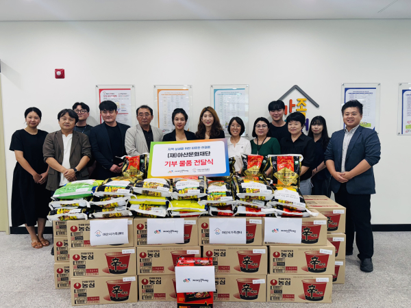 유성녀 대표이사가 개별 후원하는 라면 31박스와, 아산문화재단 임직원이 함께 후원하는 쌀 31포대(각 10kg)를 전달했다.