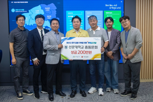 [충청뉴스 유규상 기자] 선문대학교 총동문회(회장 안원영)는 지난 14일 집중호우 피해 주민을 위한 성금 200만원을 아산시에 전달했다.