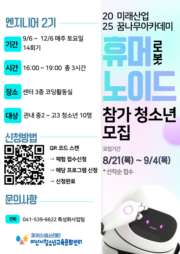 [충청뉴스 유규상 기자] 아산시청소년교육문화센터(관장 배정수)는 ‘2025년 미래산업꿈나무아카데미 엔지니어 2기’ 참가자를 오는 21일부터 모집한다.