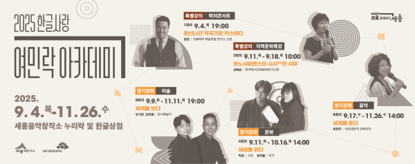 [충청뉴스 최형순 기자] 세종시문화관광재단(대표이사 박영국)이 2025년 하반기 ‘한글사랑 여민락 아카데미’ 수강생을 모집한다.