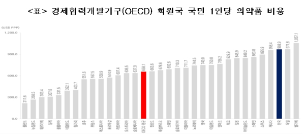 2021년 보건경제정책학회 분석에 따르면, 우리나라 제네릭(복제약) 가격은 주요 선진국보다 약 41~54% 이상 비싼 것으로 나타났다. 또한, 최근 'OECD 보건통계 2025'에서도 우리나라의 1인당 의약품 비용이 OECD 회원국 평균보다 47% 높은 것으로 발표되었다.