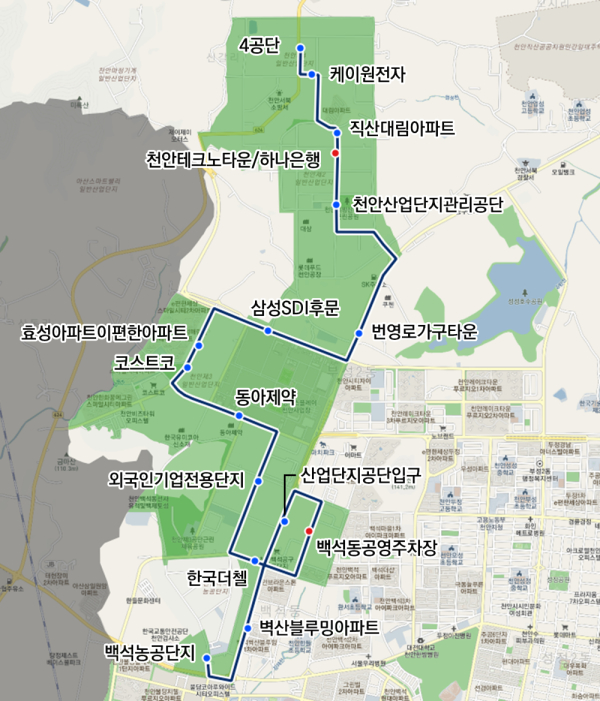 이 서비스는 평일 오전 7시부터 오후 8시까지 운행하며, 시범 운영 기간은 오는 12월 19일까지다. 산단 근로자라면 누구나 ‘천안 산단 스마트셔틀’ 앱을 통해 무료로 이용할 수 있다.
