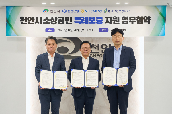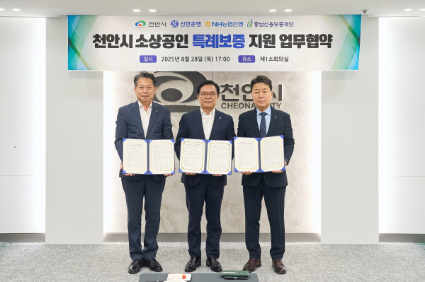 [충청뉴스 유규상 기자] 천안시는 28일 농협은행, 신한은행, 충남신용보증재단과 함께 ‘2025년 소상공인 특례보증 업무협약’을 체결했다.