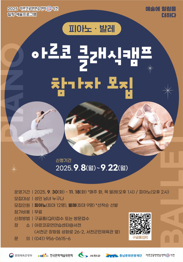참가 신청은 구글폼이나 아르코공연연습센터에 방문해 직접 신청하면 되며 피아노는 최대 12명, 발레는 최대 9명 이내 선착순으로 선발한다.