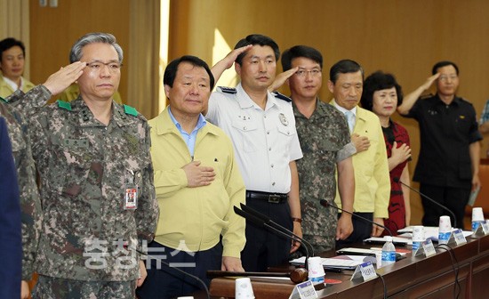 ▲ 염홍철 대전시장은 12일 오후 시청 대회의실에서 민.관.군.경 관계자 80여명이 참석한 가운데 2013 을지연습 준비상황 보고회 및 통합방위협의회 개최에 앞서 국기에 대한 경례를 하고 있다.
