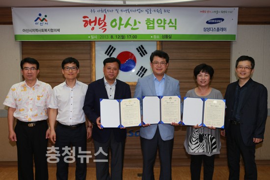 아산시가 삼성디스플레이(사회봉사단)와 지난 12일 아산시청에서 지역사회복지 협력 사업의 일환으로 아산시민의 삶의 질 향상과 우수 사회복지사 및 지역복지사업의 발굴·지원을 위한 ‘행복아산 업무 협약식’을 가졌다.