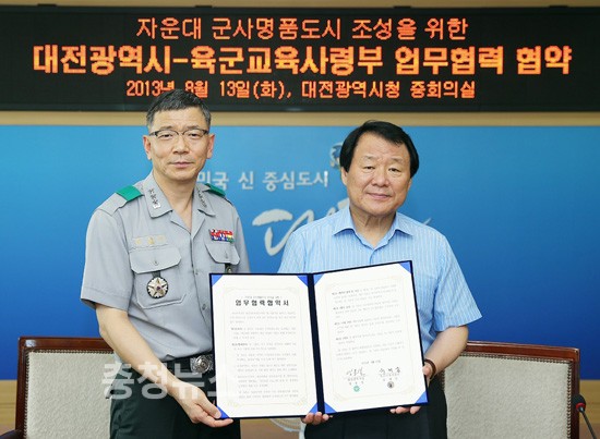 ▲ 염홍철 대전시장은 13일 육군교육사령부(사령관 류제승)와 ‘자운대 군사명품도시’ 조성을 위한 업무협력 협약을 체결했다.