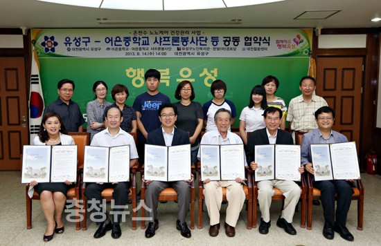대전 유성구(구청장 허태정)는 14일 오후 유성구청 중회의실에서 어은중 샤프란봉사단과 어은중학교, 유성구노인복지관, 대전힐링센터, 한빛아파트경로당 등 6개 기관 관계자 20여 명이 참석한 가운데 '노노(老老)케어' 참여 협약을 체결했다.
