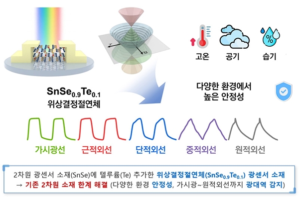 기존 광대역 광센서의 2차원 소재는 가시광선부터 근적외선까지 감지할 수 있었다. 다만 중·원적외선은 감지할 수 없고, 습기·온도 변화에 쉽게 변질되어 야외·군사용 등 일부 환경에서 쓰기 힘들었다.