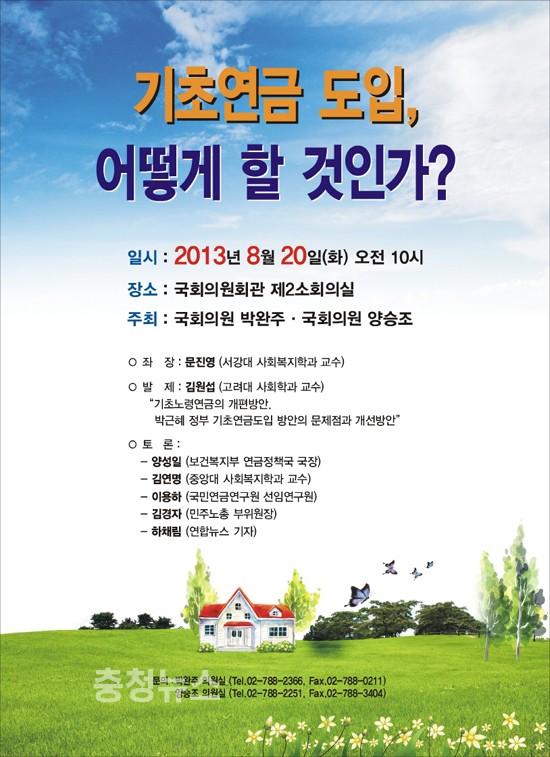 박완주 의원은 “박근혜대통령이 후보시절부터 오랫동안 공약했던 기초연금이 인수위를 이어 정부에서도 재정문제를 핑계로 표류하는 모양세”라며 “노인빈곤률이 절반에 육박한 우리 현실에 대한 각계의 목소리를 모으게 됐다”고 토론회를 제안했다.