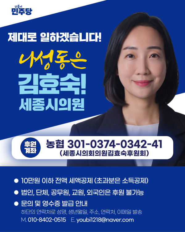 [충청뉴스 최형순 기자] 세종특별자치시의회의 김효숙 부의장(나성동, 더불어민주당)이 시민들의 정치 참여를 확대하기 위해 세종 지역 광역의원으로는 최초로 후원회를 개설하고 본격적인 홍보에 나섰다.