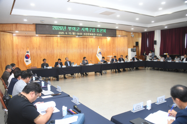 군은 지난 15일 부여군 여성문화회관에서 박정현 군수를 비롯해 부군수, 국·과·소장, 담당관, 분야별 외부 전문가 10여 명 등 총 60여 명이 참석해 ‘2026년 시책 구상 토론회’를 열고, 각 부서에서 발굴한 신규 시책을 공유하는 자리를 가졌다.