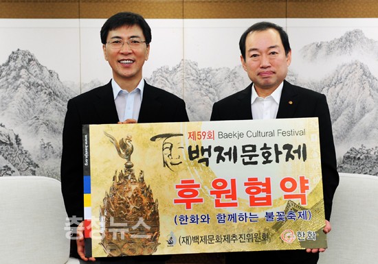 이날 협약식에서 정승진 한화이글스 대표이사는 한화그룹을 대표해 안희정 충청남도지사에게 ‘백제문화제 후원 협약증서’를 전달했으며, 안희정 지사는 정승진 대표이사에게 ‘제59회 백제문화제 공식후원사 인증서’를 전달했다.