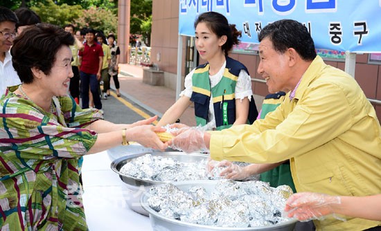 대전시 중구(구청장 박용갑)는 20일 ‘2013 을지연습’ 일환으로 전시 비상 사태시 발생될 수 있는 급식 차질을 가상해 주먹밥과 옥수수를 전시 비상식량으로 시식하는 체험훈련을 실시했다.