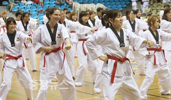 배재대 ‘배재국제여름학교(PaiChai International Summer School)’에 참여한 세계 13개국 180명의 외국인 학생들이 20일 21세기관 스포렉스에서 태권도 체험을 하고 있다.