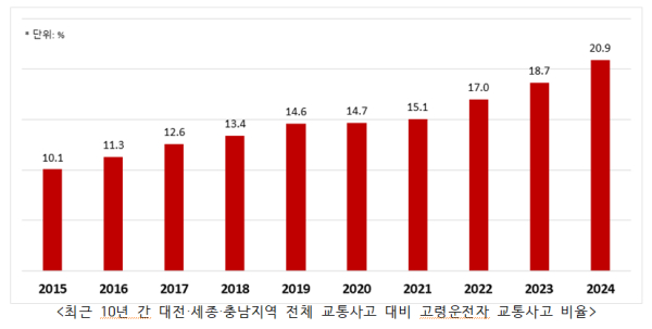 대전·세종·충남지역 전체 교통사고에서 고령운전자 사고가 차지하는 비율 또한 10년 전인 2015년 10.1%에서 2024년 20.9%로 지속적으로 높아지고 있는 것으로 나타났다.