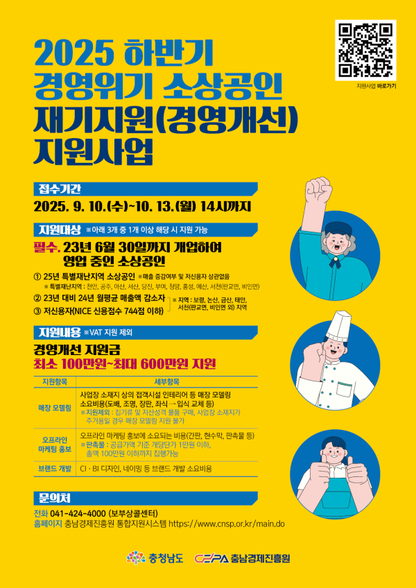 이번 모집은 경영개선의 시급성이 높은 점포 현장 지원에 초점을 맞춰 2025년 폭우 피해로 지정된 특별재난지역(천안·공주·아산·서산·당진·부여·청양·홍성·예산·서천 판교면, 비인면) 소재 소상공인은 별도 조건없이 신청이 가능하다.