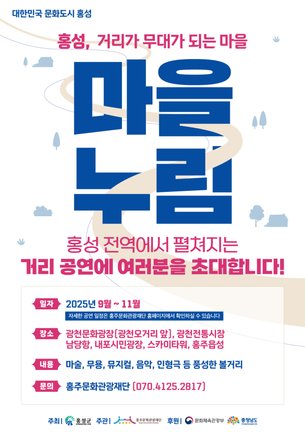 [충청뉴스 박영환 기자] 홍주문화관광재단은 오는 11월까지 ‘2025 로컬 문화향유 확대 마을누림 거리 공연'을 개최한다고 18일 밝혔다.
