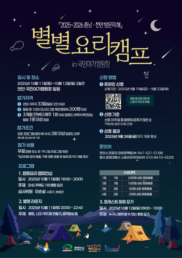 시는 ‘2025~2026 천안 방문의 해’를 맞아 외부 관광객 유치를 위해 다음 달 11일부터 12일까지 1박 2일간 천안국민여가캠핑장에서 별별 요리 캠프를 진행한다.