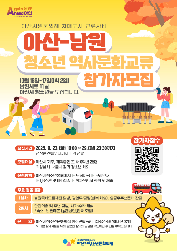 [충청뉴스 유규상 기자] 아산시청소년재단 산하 아산시청소년문화의집(관장 지명근)은 ‘2025~2026 아산 방문의 해’를 기념하여 추진하는 자매도시 간 청소년 역사·문화 교류사업의 일환으로 남원시 방문편 참가 청소년을 오는 9월 23일부터 29일(월)까지 모집한다.