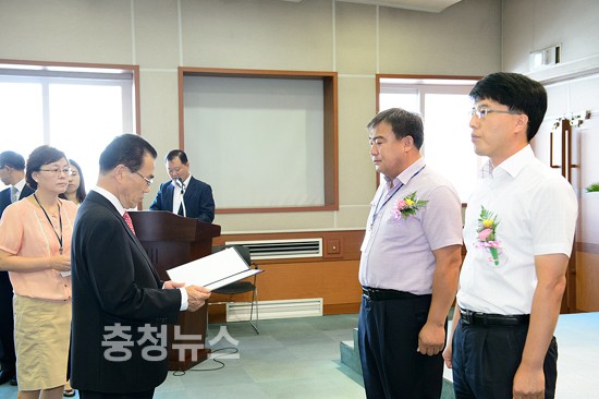 ▲ 유한식 세종시장이 2일 시청 대강당에서 열린 월례조회에서 ‘이달의 베스트 세종상’을 수상한 김종락 유통가공담당에게 상패를 전달하고 있다.