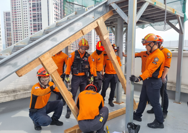 훈련에서는 ▲붕괴사고 현장에서 목재를 활용한 불안정 구조물 지지훈련(경사면 지주 설치) ▲측량·절단·설치 등 팀 단위 역할 분담 훈련 ▲현장 안전관리 절차 숙달 등을 중점적으로 다뤘다.