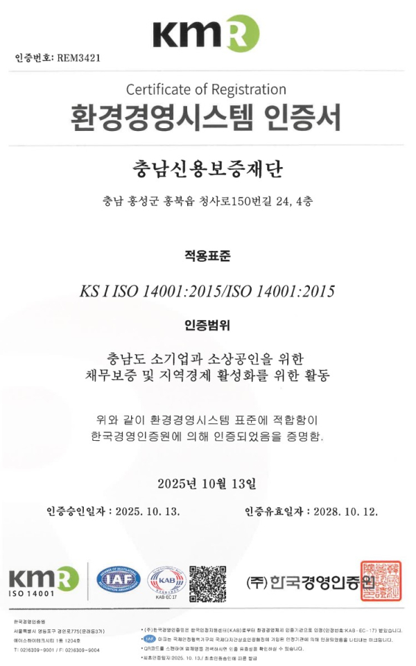 [충청뉴스 박영환 기자] 충남신용보증재단은 한국경영인증원(KMR)으로부터 'ISO 14001:2015'(환경경영시스템) 인증을 취득했다고 17일 밝혔다.