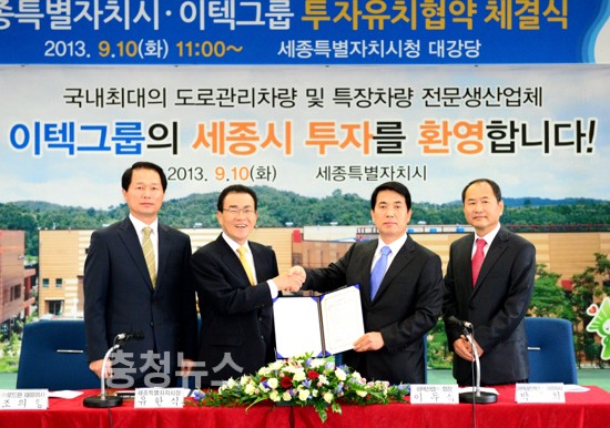 세종특별자치시(이하 세종시, 시장 유한식)가 10일 오전 시청 대강당에서 국내 최대의 다목적 도로관리차 및 특장차 전문제조사인 이텍그룹과 대규모 투자협약을 체결했다.