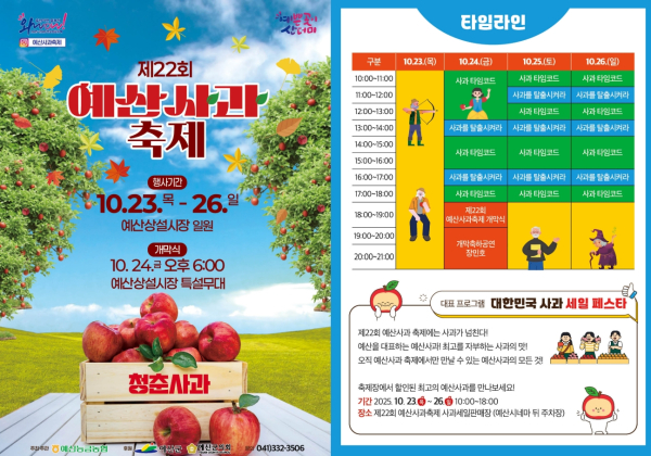 [충청뉴스 박영환 기자] 예산군은 10월 23일부터 26일까지 4일 동안 예산상설시장 일원에서 ‘청춘사과’를 주제로 ‘제22회 예산사과축제’를 개최한다고 밝혔다.