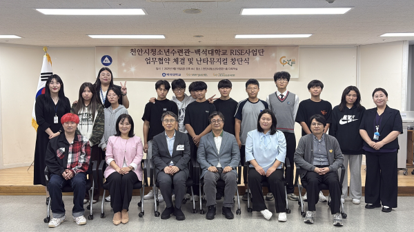 [충청뉴스 유규상 기자] (재)천안시청소년재단(이사장 김석필)은 지난 9월 19일(금) 천안시청소년수련관에서 백석대학교RISE사업단과 업무협약식 및 청소년 난타뮤지컬 창립식을 개최했다.