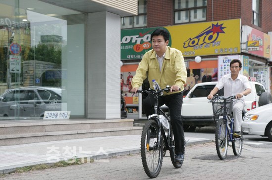 ▲ 정용기 구청장이 자전거로 현장행정을 실시하고 있다.