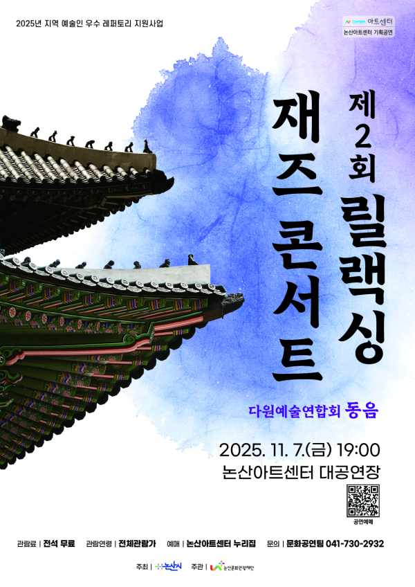 [충청뉴스 논산 = 조홍기 기자] (재)논산문화관광재단(이사장 백성현)은 오는 11월 7일(금) 19시에 논산아트센터 대공연장에서 다원예술연합회 동음 <제2회 릴랙싱 재즈 콘서트> 공연을 진행한다고 밝혔다.