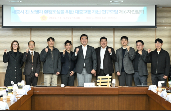 [충청뉴스 최형순 기자] 세종특별자치시의회(의장 임채성) ‘세종시 친 보행자 환경조성을 위한 대중교통 개선 연구모임’(대표의원 최원석)이 연구용역 최종보고회를 끝으로 보행자 안전 강화를 위한 심도 있는 논의를 마무리하고 활동을 마쳤다.