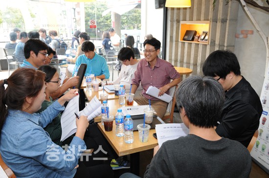 ▲ 충남테크노파크 바이오센터 직원들이 점심 도시락을 먹은 뒤 애로사항 해결을 위한 토크 행사를 갖고 있다.