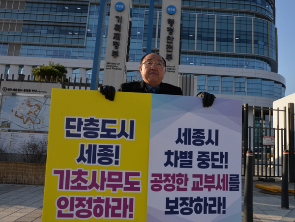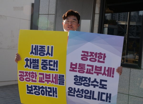 박상희 세종시회장은 "세종시 차별 중단, 공정한 교부세를 보장하라"는 피켓을 들고, "행정안전부의 지방교부세 시행규칙 개정을 신속히 추진할 것"을 촉구했다.