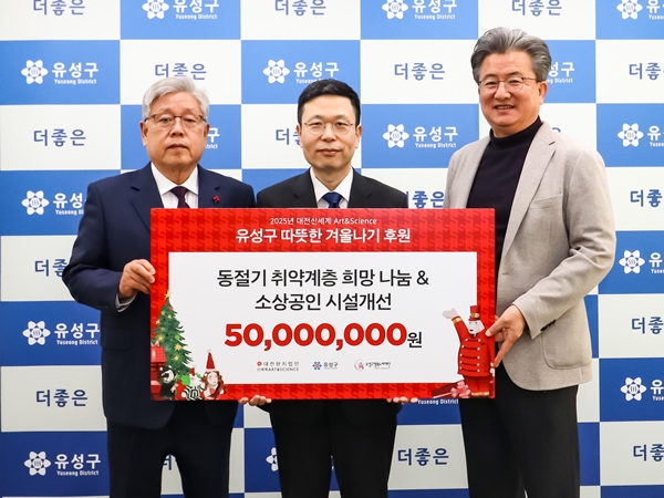 대전신세계는 대전 유성구청에서 정용래 유성구청장, 이용환 대전신세계 대표이사, 강도묵 유성구행복누리재단 이사장 등이 참석한 가운데 ‘2025 대전신세계 Art&Science 따뜻한 겨울나기 후원금 전달식’을 열고 성금 5000만원을 전달했다.