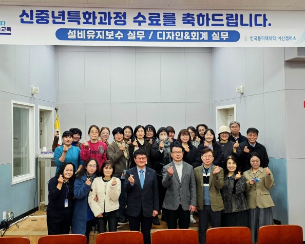 [충청뉴스 유규상 기자] 한국폴리텍대학 아산캠퍼스(학장 이성근)는 지난 1일 신중년특화과정 에서 ‘설비유지보수 실무’ 22명, ‘디자인&회계 실무’ 20명 등 총 42명의 교육생이 3개월간의 교육을 마치고 수료했다.