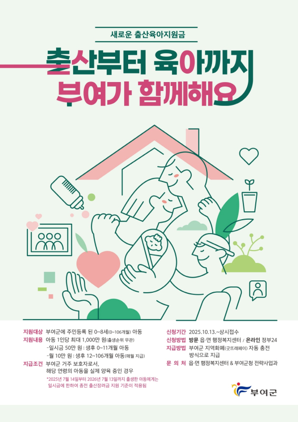 출산육아지원금은 출생 순위와 관계없이 0세부터 만 8세까지의 아동 누구나 최대 1,000만 원을 지원하는 부여군의 핵심 저출산 대응 정책이다.