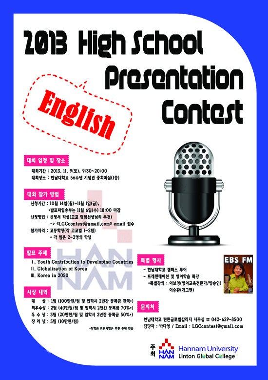 대전 한남대 린튼글로벌칼리지(LGC)는 내달 9일 교내 56주년기념관 중회의실에서 전국 고교생들을 대상으로 하는 ‘전국 고교 영어발표대회’를 개최한다.