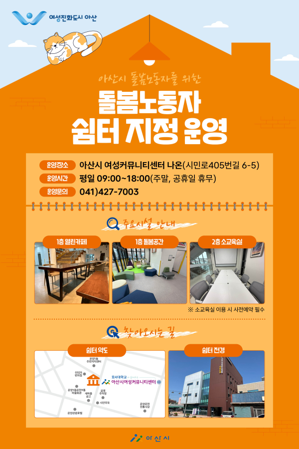 [충청뉴스 유규상 기자] 아산시(시장 오세현)는 지역 돌봄노동자의 건강한 근무환경 조성과 휴식권 보장을 위해 여성커뮤니티센터 ‘나온(ON)’을 ‘아산시 돌봄노동자 쉼터’로 공식 지정해 운영한다.